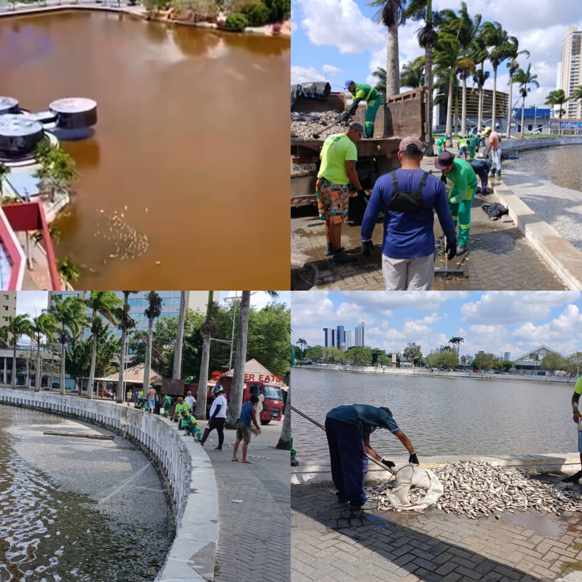 Equipes da Sesuma estiveram neste domingo (11) retirado peixes mortos e fazendo uma limpeza nas margens do açude na busca por amenizar o problema.